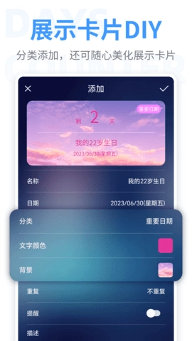 倒数日功能是软件的一个特色。它可以帮助你倒数日子,记录倒计时的天数。无论是你们的纪念日,还是其他重要的日子,你都可以设置倒数日功能来提醒自己还有多少天就要到达这个日子。你就可以提前做好准备,为这个特殊的日子做出安排。除了倒数日功能,软件还有其他实用的功能。你可以使用它作为一个日期计算器,帮助你计算日期之间的天数。这对于一些特殊的日子,比如生日、节日等,非常有用。你可以通过软件来提醒自己还有多少天就要到达这个特殊的日子,以便提前准备庆祝活动。