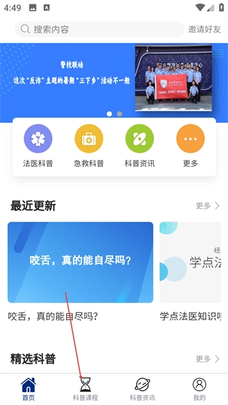 1、在首页找到【法医科普】-【急救科普】等功能,还能查看【最近更新】的科普内容,点击底部【科普课程】进入对应板块。