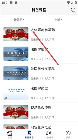 2、进入【科普课程】页面后,可看到【人体解剖学基础】-【法医学鉴定】等课程,还能查看各课程的学习人数。