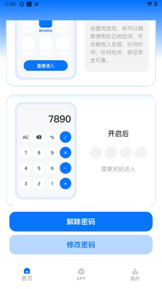 进入这款软件后,你可以为应用设置专属密码,只有输入你设定的密码才能解锁并打开软件,能很好地保护个人隐私;要是觉得麻烦,也可以随时解除密码设置。
