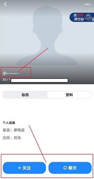4、在此用户界面中,能够点击底部的操作选项,实现关注或聊天功能。