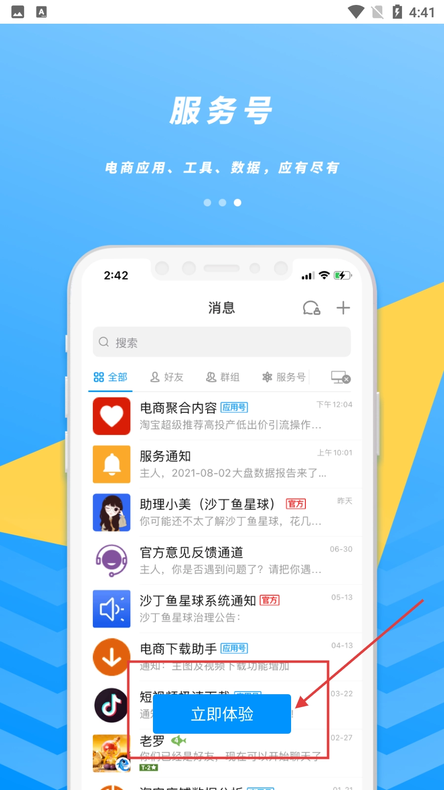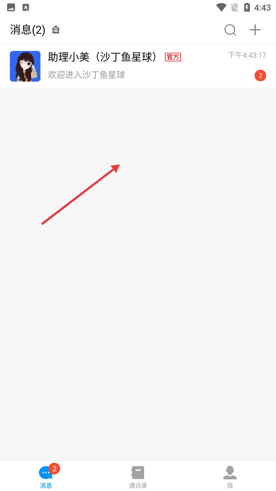注册完成后,进入消息页面,就能看到【助理小美(沙丁鱼星球)】发送的欢迎消息,随后即可开始使用各项功能。