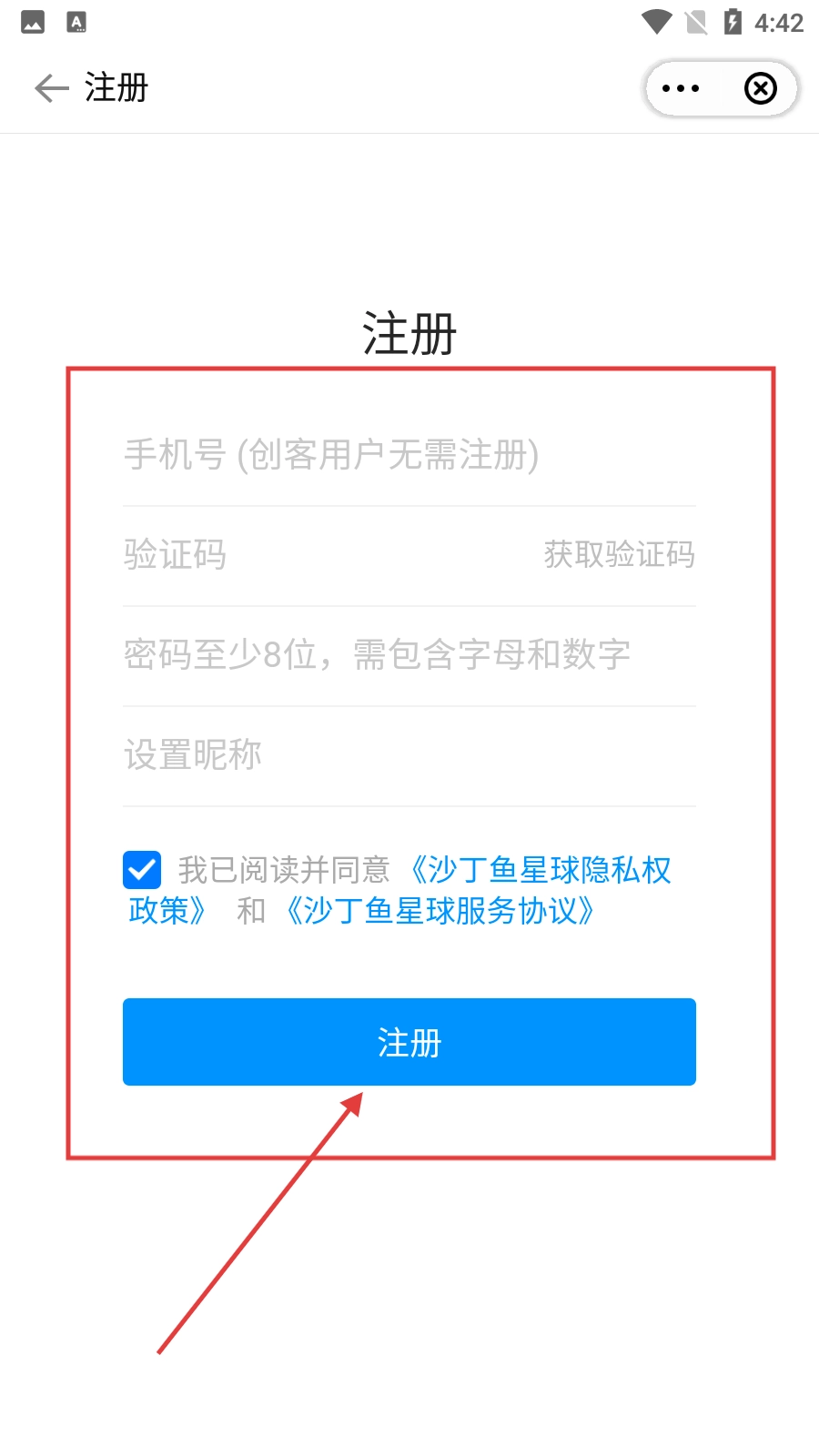 进入沙丁鱼星球的介绍页面后,点击【立即体验】按钮,就能进入登录注册界面。