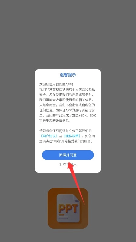 首次使用时,请仔细阅读平台的服务条款和隐私政策,确认无误后,点击“阅读并同意”按钮即可进入应用。