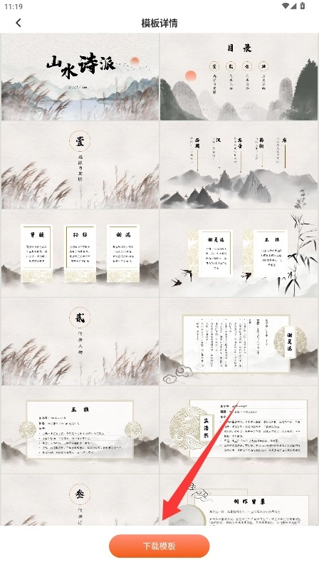 挑选出你感兴趣的模板后,点击进入详情页面,就能预览所有幻灯片的内容以及设计风格。