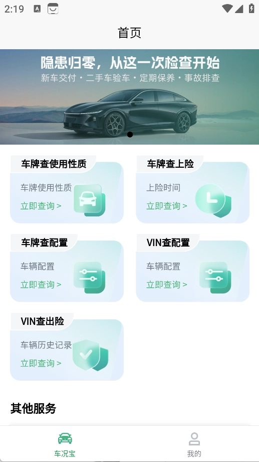 在首页能使用车牌查询使用性质、车牌查询上险情况、车牌查询车辆配置、VIN码查询配置以及VIN码查询出险记录等服务。