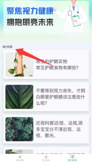 打开御元养和应用后,在首页的功能栏里找到“视力科普”专区并点击,即可进入视力健康科普页面。