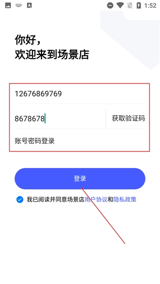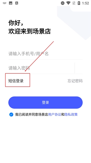 2、在“场景店”登录页,选择【短信登录】方式,切换至手机号+验证码的登录界面。