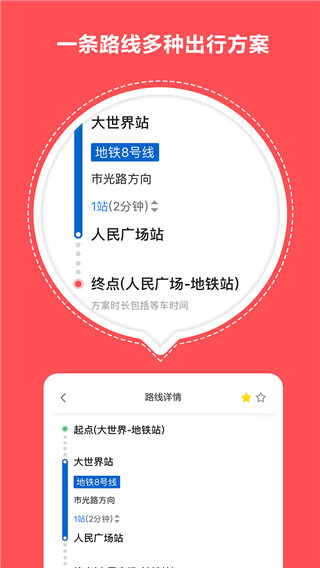 地铁路线查询功能:输入出发地和目的地,即可查询地铁路线、换乘方式、地铁站地图导航路径等内容,同时支持多种路线方案的切换与选择。