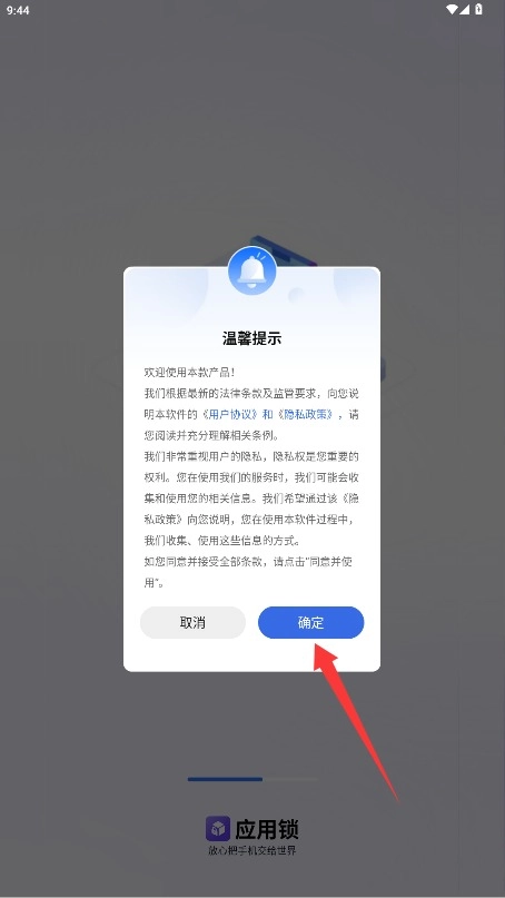首次使用时,请仔细阅读用户服务协议和隐私政策,确认无误后点击“确定”选项即可进入应用。