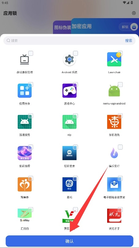 在应用列表页面勾选想要加密的程序,选好后点击确认按钮就能完成提交。