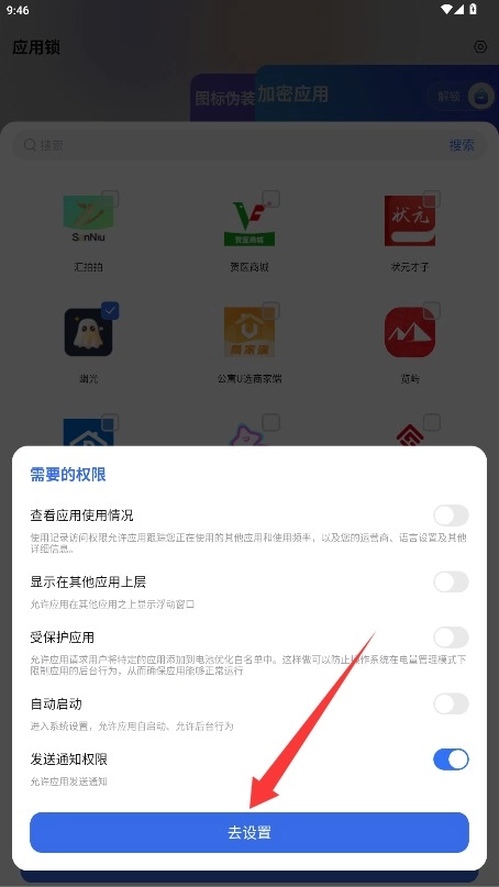 请根据系统提示进入权限设置界面,开启所需权限后返回,这样就能完成应用加密操作了。