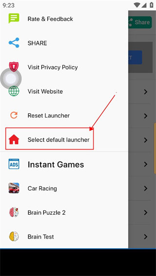 3、往下划找到select default launcher选项点击。