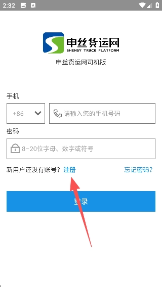 1、在【申丝货运网-司机版】登录界面,若为新用户,点击【注册】选项进入账号注册流程。