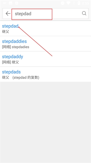 4、在搜索框中输入【stepdad】,就能得到这个单词的含义解释以及像【继父】这类相关变体形式,从而帮助大家学习英语词汇。