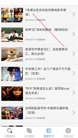 2、在【英语学习】页面,能够浏览多篇与英语学习相关的文章,像《7条建议告诉你如何看电影学英语》这类内容,点击文章即可查看具体详情。