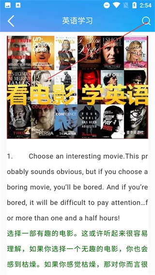 3、打开【看电影学英语】文章,就能查看英文学习内容以及对应的中文翻译,大家可以按照这个方法来学习英语知识。