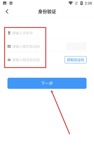 2、按顺序填写【请输入手机号】【请输入图形验证码】【请输入短信验证码】,点击【获取验证码】后再点击【下一步】。