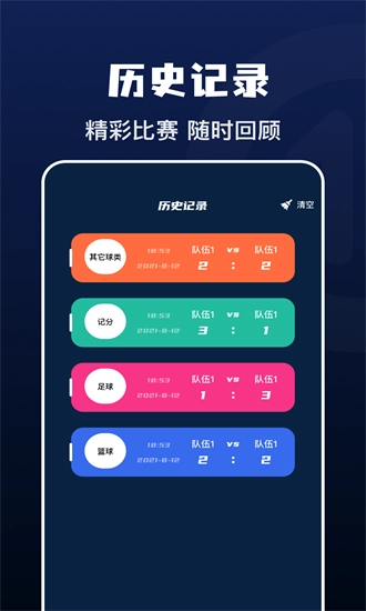 支持历史记录保存功能,过往比赛数据可随时查看,有助于回顾分析比分情况,也方便后续进行对比。