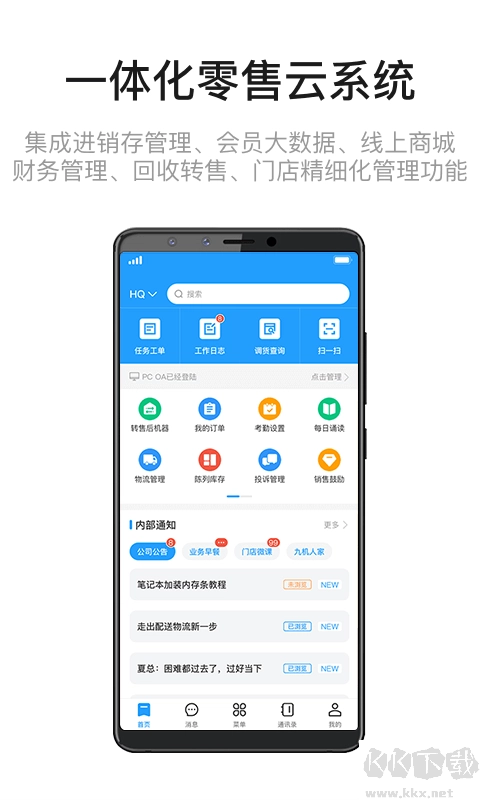 九讯云,通常也被称作九讯云oa系统。它是依托九机零售模式,专门为手机零售行业量身打造的系统服务平台,涵盖了O2O电商平台、全功能OA管理系统,并且系统深度整合了CRM、旧机回收转售、智慧物流、财务、营销、运营、店面管理、人力资源、培训管理等功能模块。该平台汇聚了九机多年沉淀的零售能力与资源,能够为零售商提供业务生态构建、线上线下一体化融合、门店精细化管理等全方位的数字化转型解决方案,帮助企业打造核心零售竞争力,从而实现可持续发展。