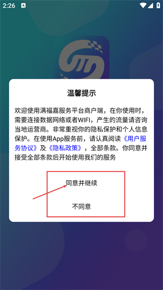 进入满福嘉服务平台商户端后,会弹出温馨提示弹窗,点击【同意并继续】按钮,就能进入应用后续流程。