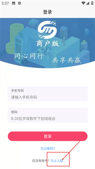 2、进入登录界面后,若已有账号,可填写【手机号码】和符合要求的密码,再点击【登录】按钮;若没有账号,则点击【马上入驻】,进入商户注册环节。