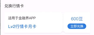 兑换行情卡,也就是大家常说的level-2,兑换之后就能在金融界平台实时查看十档行情、买卖队列和逐笔成交信息,精准把握主力动向。月卡仅需600豆即可购买。