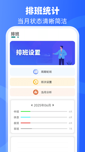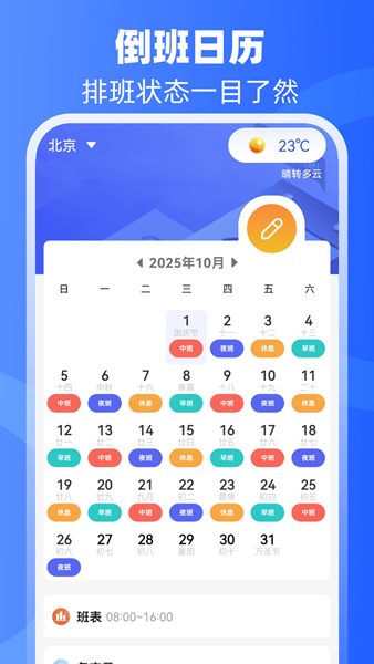 倒班日历安卓免费版专为倒班用户打造便捷的日历记事服务,您可以通过日历完成倒班记录保证不记错自己的班次,通过排班统计便捷的设置每一天的班次,同时提供便利的闹钟提醒功能,让你无需频繁调整闹钟。