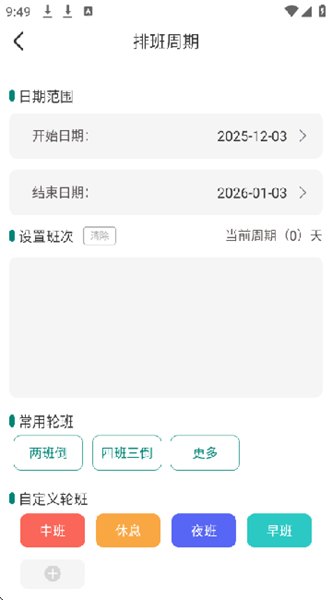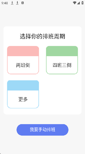 1、首先打开app,您可以选择自己的排班周期,也可以点击下方开始手动排班。