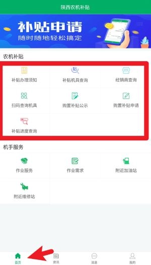 在首页界面点击对应的图标,就能快速进入补贴申请、机具查询、扫码核验以及申请公示等功能模块的操作入口。