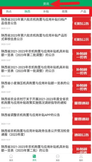 在资讯页面,您能够浏览到陕西省最新发布的农机补贴政策、机具归档公告以及补贴金额调整通知,从而及时掌握权威信息。
