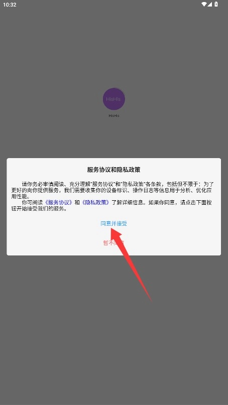 首次使用时,请仔细阅读用户服务协议和隐私政策,确认无误后,点击“同意并接受”选项即可进入应用。