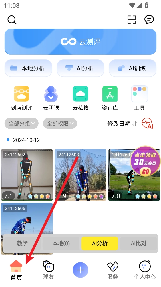 登录成功后,点击底部的“首页”,即可查看挥杆分析以及相关的打点记录内容。