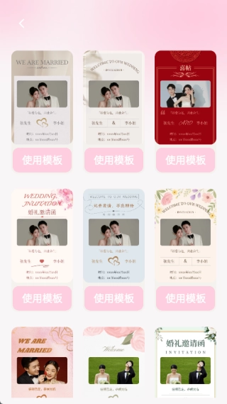 婚礼邀请页面提供了多种不同的模板,用户只需根据自己的喜好挑选其中一款使用就行。