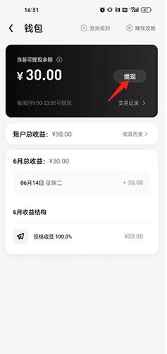 点击“提现”选项就可以了。需要注意的是,第一次提现的金额不能低于100元。