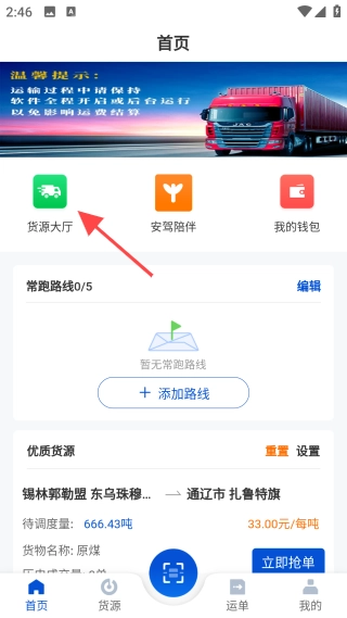 进入首页后,点击【货源大厅】的图标,就能查看系统推送的货源信息了。