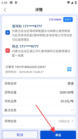 浏览货源列表,挑选你感兴趣的订单查看具体信息,点击【承运】按钮就可以了。