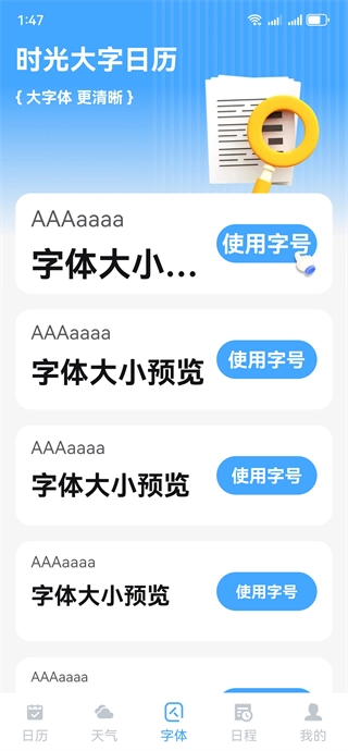 时光大字日历是专为中老年人开发的大字版日历查询工具,其手机界面采用全放大字体设计。这款安卓应用还提供个性化设置功能,用户能依据自身需求调整字体大小。感兴趣的朋友不妨试试时光大字日历,轻松清晰地查看日历里的各项信息。