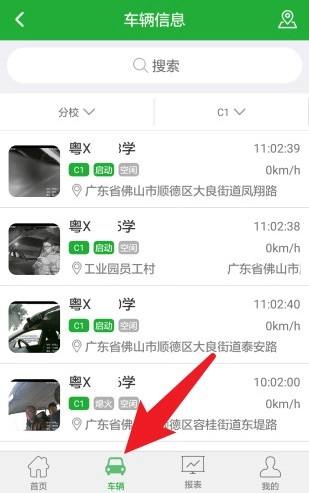 点击底部的“车辆”栏目,就能查看教练车辆的实时信息,像位置、速度以及监控画面都能看到。