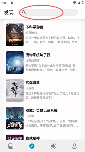 接下来点击页面下方的“发现”按钮,就能浏览到种类繁多的小说资源了。