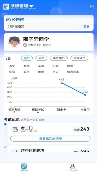这是一款专为学校场景打造的成绩管理软件,提供多样化的成绩记录方式,支持精细化的成绩信息管理,还具备系统排名查询、标签分类、学习笔记等实用功能。此外,软件能够直观呈现成绩趋势图、排名趋势图、各科分析雷达图以及成绩对比图等数据可视化内容。