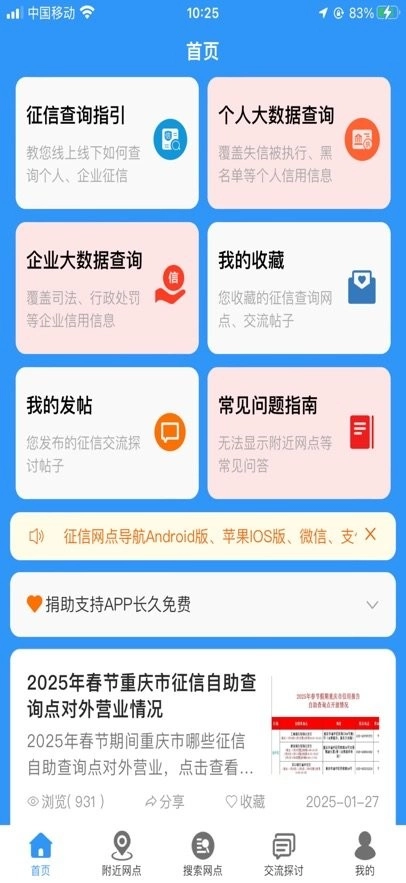 本提供个人、企业信用报告线上、线下查询打印操作指南,支持全国范围征信报告查询和打印网点的地图定位,可以根据行政地区、关键字等快速搜索征信查询网点,可以一键地图导航至离您附近的征信查询网点,可以查询个人和企业大数据信用信息,操作简单,方便快捷。