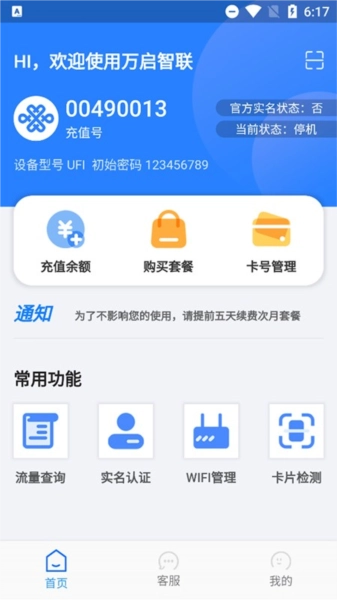 万启智联软件支持一个账号绑定多张卡号,用户能一键完成卡号的切换与解绑,大幅提升了使用便捷性。此外,用户可直接查看设备的流量使用状况以及卡号的实名认证状态,还能灵活管理各类套餐,只要支付成功就能立即启用设备网络。