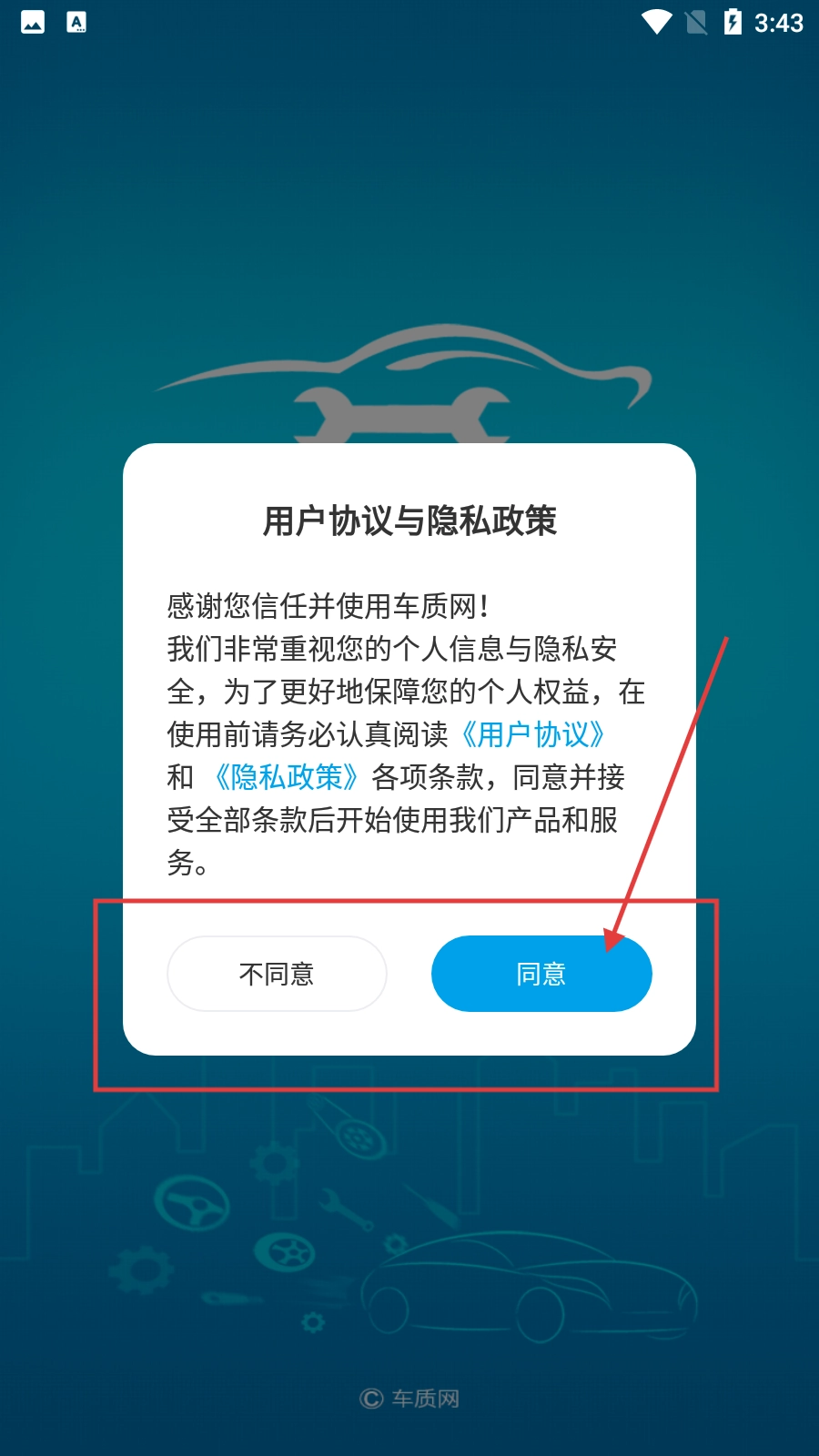 在车质网的用户协议与隐私政策弹窗里,点击【同意】按钮,就能进入软件主界面。