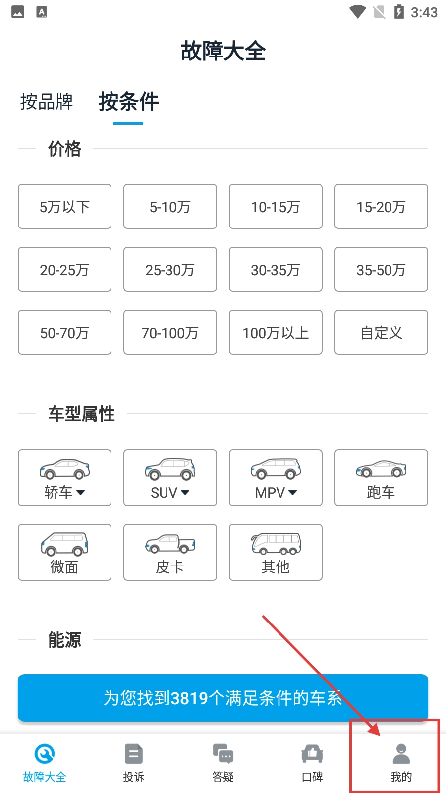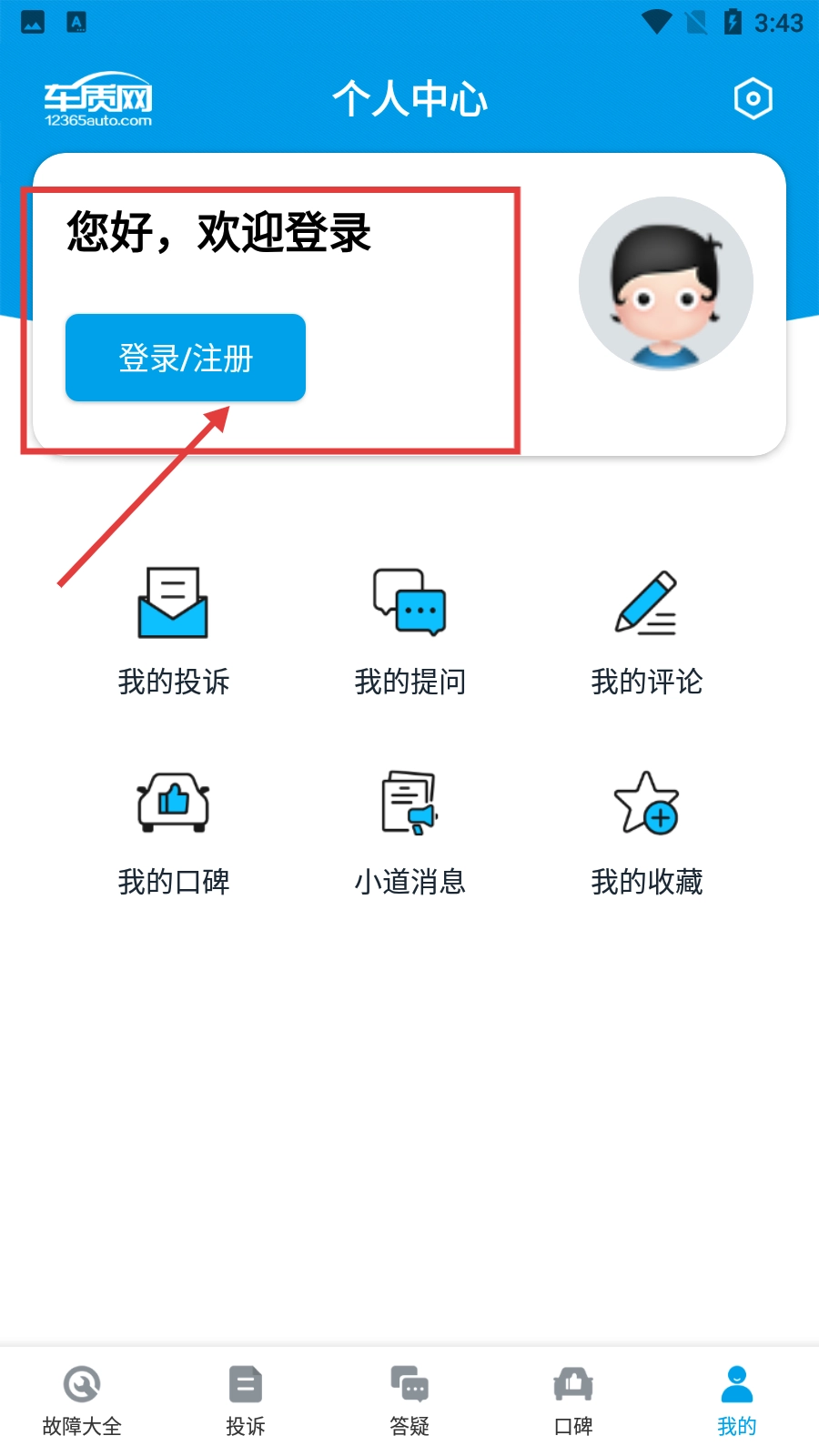 在车质网的主界面上,点击底部导航栏中的【我的】选项,就能进入到个人中心页面。