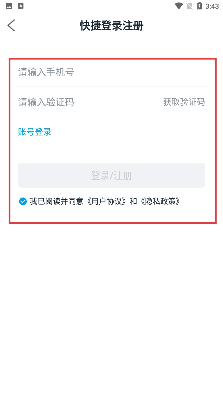 在快捷登录注册页面,输入手机号后获取并填写验证码,点击【登录/注册】按钮,就能完成账号的登录或注册操作。