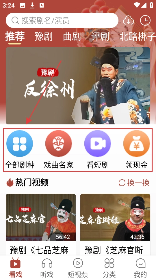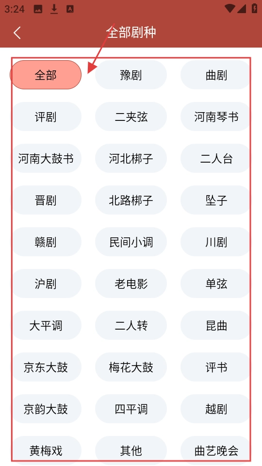 进入首页后,能看到【全部剧种】【戏曲名家】等功能选项。要是想查找各类戏曲,点击【全部剧种】,就能查看所有剧种的分类了。