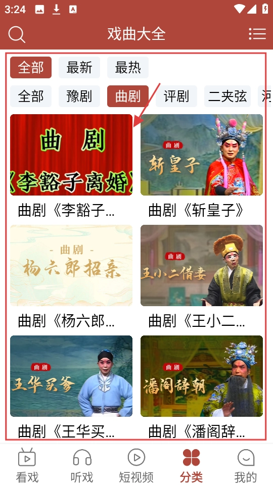 进入戏曲大全页面后,选择【曲剧】分类,就能看到《李豁子离婚》《斩皇子》这类曲剧作品,挑选自己感兴趣的点进去播放即可。