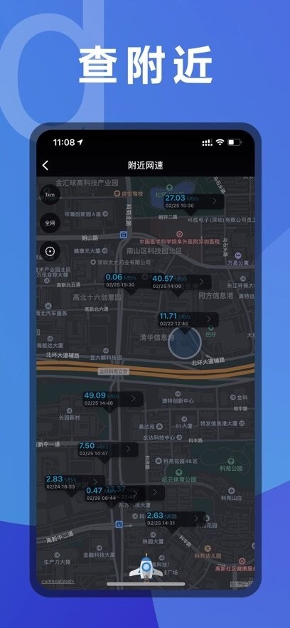 附近网速:地图定位,显示周边其他用户网速快慢;