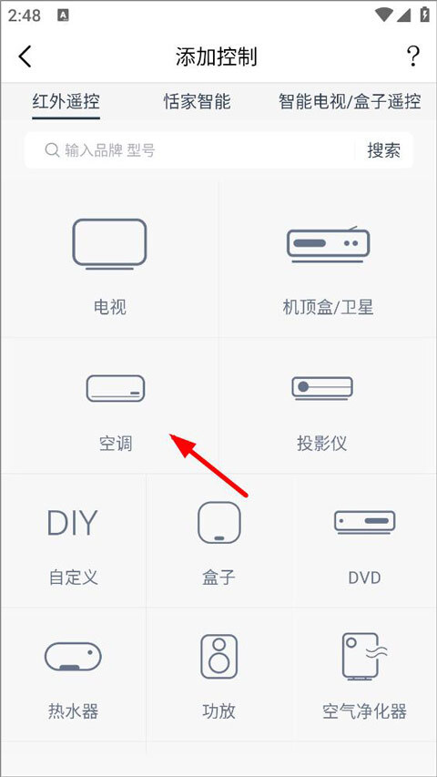 3、进入设备添加页面,用户选择红外遥控类目下的空调;